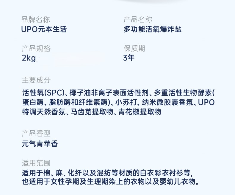 商品名称:(巨邦佑)BJ+UPO元本生活 多功能活氧爆炸盐2kg 婴幼儿白色衣物通用洗衣去污渍强去黄彩漂漂白