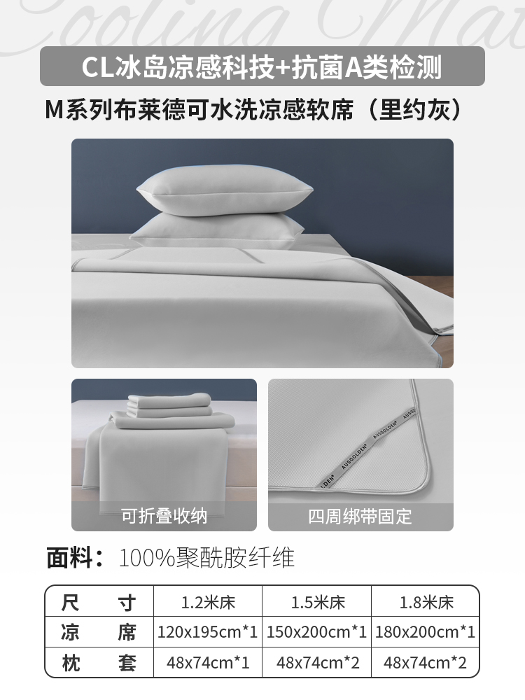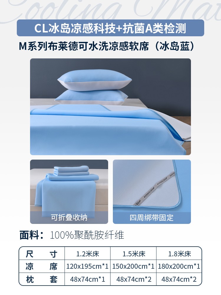 商品名称:(巨邦佑)BJ+AusGolden超柔凉感席套件(凉席+枕套) 不含床垫 100%聚酰胺纤维 三件套澳洲凉席冰丝席冰丝凉席可机洗夏凉席宿舍防螨抗菌高端软席