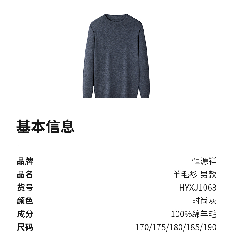 商品名称:(世星阳光)+恒源祥 羊毛衫 HYXJ1063 规格 170 175 180 185 190 颜色 时尚灰 男款 下单备注尺码 时尚百搭 贴身舒适